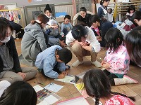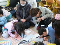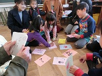 今日は、5歳児親子が、「何の字にしようかな」「絵うまいな」と、親子で楽しく会話を楽しみながらかるた作りをしました。生活習慣のことや小学校向けての抱負など、いろんな札ができあがり、最後にかるた大会をしました。みんな真剣な表情でかるたをとり、楽しいひとときでした。