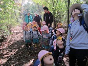 3歳児は、初めて遠足で甘南備山に登りました。「葉っぱがきれいね」と「ドングリいっぱいや」と元気に山道を歩きました。