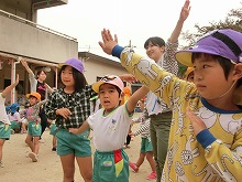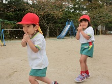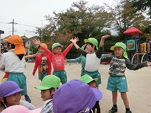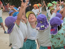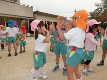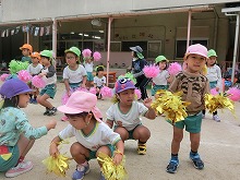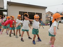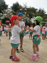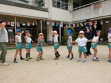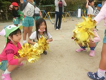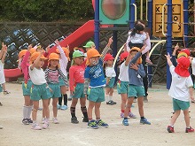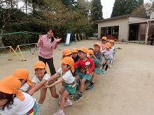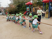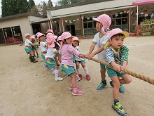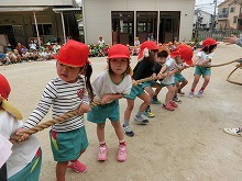 運動会を土曜日に終え、今日は異年齢で交流しながら運動会ごっこを楽しみました。みんなの競技をよくみていたので、曲がかかるといろんな学年の子どもたちが集まってきて「忍者したい!」「小さなヒーローの曲かけて!」と、楽しくリズム遊びをしました。最後は、綱引き対決。運動会では、保護者競技の応援だけでしたが、今日は、子ども達だけでしました。「よいしょよいしょ」「がんばれー」と、みんなで力いっぱい綱を引きました。「明日もしようね」と、まだまだ運動遊びを楽しんでいる子どもたちです。