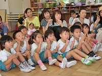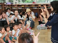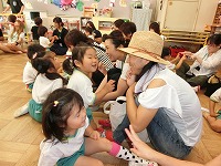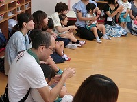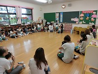 3歳児親子で、わらべうた遊びを楽しみました。「雨が好きなおうちを背中に背負っている生き物はなあに?」「かたつむり?」と、わらべうたの先生とお話を楽しみながらカタツムリやカエルや雨など、季節にちなんだわらべうたを教えていただきました。優しいゆったりした言葉やリズムに、子どもたちもおうちの方も、興味深々です。昔から歌い継がれてきたわらべうたは、子どもの心にも響いたようでした。わらべうたを通して、親子のふれあいを楽しんだり、手遊び指遊びの経験や季節感を感じたりする機会を大切にしていきたいです。