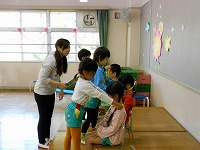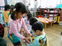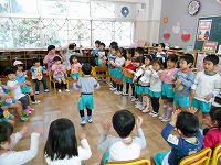 3歳児は、5歳児がクラスに行き、なかよし会をしました。一緒に歌を歌ったり、手遊びをして楽しく過ごしました。これからも、一緒になかよく遊びましょうね。