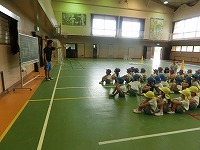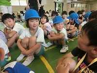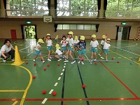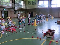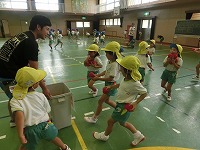 5歳児が小学校の先生に出前授業をしていただきました。小学校の先生の話を真剣に聞く5歳児の子どもたち。玉を宝物に見立てて、楽しいゲームをしました。「どうやったら箱に入るかな?」の問いかけに、「はい!」と元気よく手をあげて答えていました。何度も玉投げをして、いっぱい体を動かして遊ぶことができました。