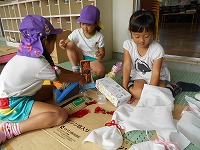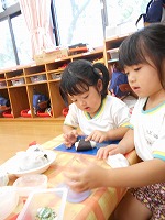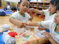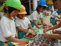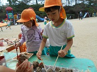ドングリや紙や箱などを使って、子ども達が思い思いのものを作っています。「おにぎりつくってん。食べて」「おすしできたよ」3歳児の子どもたちが、いろんなクラスを回って売りにきてくれます。4歳児は、はしでたこ焼きをひっくり返したり、ソースやおがくずのふりかけをかけたり・・・と、たこ焼きを焼いている姿が、さまになっています。5歳児も、お菓子屋さんやアクセサリー屋さんのお店作りに奮闘中!みんなで、お店屋さんの準備に大忙しです。