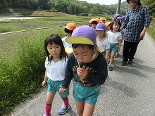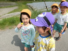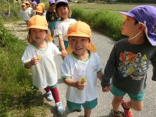 今日はとってもいい天気。4,5歳児の子ども達が、仲良く手をつないで散歩に行きました。竹林でタケノコが大きく伸びているのをを見つけて「おっきいなー」と、びっくりしたり、「いっぱいお花咲いてる!」と、一緒に摘んだりと、幼稚園の近くは自然がいっぱいでいろんな発見ができます。季節ごとに散歩にいったり、遠足にいったりと、今年もいっぱい歩いて豊かな自然を感じたいと思います。