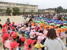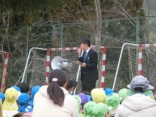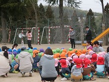 小学校との合同避難訓練がありました。大規模の地震と火事を想定し、幼稚園で避難した後、小学校に移動しました。大勢の小学生が避難してくる様子をみたり、阪神淡路大震災の出来事を校長先生から聞いたりして、火事地震の怖さを改めて感じていた子ども達です。幼稚園で月に1回の避難訓練を経験している子ども達は、落ち着いて行動し、校長先生の話を静かに聞くことができました。