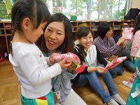 8日は、母の日。子どもたちは、内緒でつくったプレゼントを大好きなお母さんに渡しました。一緒に手遊びをしたり、歌のプレゼントをしたりして、お母さんとのひとときを楽しみました。「いつもおうちのことをしてくれる!」「一緒に遊んでくれる!」「寝る前に絵本を読んでくれる!」と、お母さんのことが大好きな子ども達。いつまでも元気で素敵なお母さんでいてくださいね。
