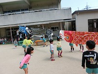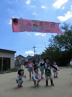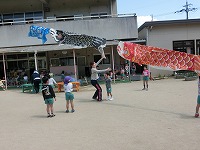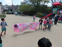 5歳児の子どもたちが、みんなで作ったこいのぼりをあげました。空に気持ちよく泳ぐこいのぼりを見て、子どもたちも満足そうです。風を受けて元気に泳ぐこいのぼりのように、元気いっぱいの子どもたちです。