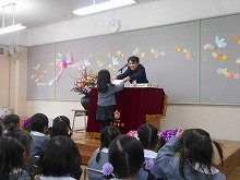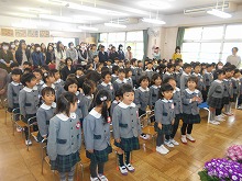今日は第3学期の終業式を迎えました。一人ずつ、1年間楽しんだこと、頑張ったことが書かれているミニ賞状のご褒美をもらいました。4歳児は、5歳児の修了式の様子をみていたので、上手に壇上にミニ賞状をもらいにくることができました。保護者の皆さまから、一人一人に温かい拍手をしていただいた子ども達は、とても嬉しそうでした。