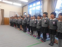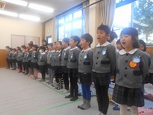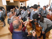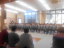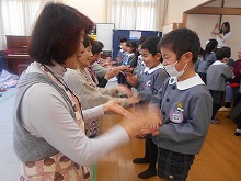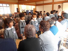 一休ケ丘地域にお住まいの高齢者の皆さんとの触れ合いが公民館でありました。歌や小物入れのプレゼントを準備していた5歳児の子どもたち。「知ってるおじいちゃんいはるかな」と、楽しみにしていました。皆さんに温かく迎えていただき、歌を披露したり、温かい手のぬくもりを感じながら「お寺の和尚さん」のわらべ歌を一緒にしたり、○×クイズをしたりと楽しい時間を過ごしました。「小学校に行っても元気で勉強、運動に頑張ってくださいね」と、励ましていただきました。皆様に見守られながら、元気な一年生になってくれることと思います。