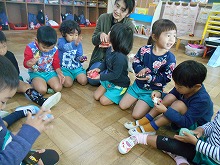 3歳児がわらべ歌遊びで、お手玉を頭にのせて歩いたり、「ぺったら ぺったん」と、おもちに見立てて遊んだりしました。「お手玉落ちそう!」「上手に歩けた」と、わらべうたの心地よいリズムに合わせて楽しみました。