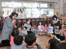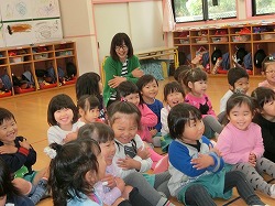 今日は、3歳児がわらべ歌で遊びました。お手玉を頭にのせて落ちないようにバランスをとったり、餅にみたてて丸めたりと楽しく遊びました。12月にあるもちつき大会を楽しみにしながら、わらべ歌に合わせてお手玉を優しく丸めていた子ども達です。笑顔いっぱいで友達とのふれあいを楽しみました。