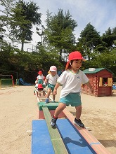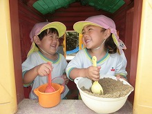 巧技台をそろりそろりと渡り何度も挑戦したり、「一緒に混ぜよう」「見て、ケーキできた」と、砂場で一緒にごちそうづくりを楽しんだりと自分の好きな場所や遊びを見つけています。