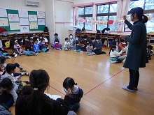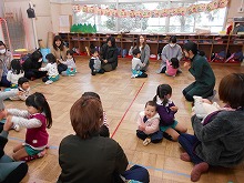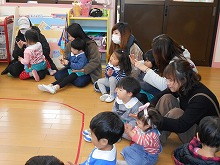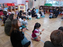 3歳児は一年間を通して、わらべ歌遊びを楽しんできました。今日は、親子でふれあい遊びをしながら、わらべ歌遊びをしました。つくしの遊びやお手玉を使っての遊びなど、季節を感じながら友達やお母さんと一緒に楽しむことができました。この一年間、心地よいリズムを感じながら昔ながらの歌遊びに親しんできました。子ども達の大好きな遊びを大切に伝承していきたいと思います。