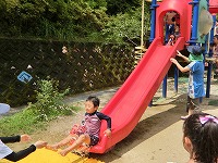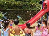 今日は久しぶりの晴天!5歳児の子どもたちは、幼稚園の滑り台でウォータースライダーをして遊びました。「えープールの滑り台みたい!」と、ワクワク感いっぱいで、順番に滑りました。思ったよりスピードがでて、「はやーい」「ロケット発射!!」と、スリルとスピードを味わった子どもたちです。