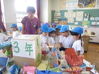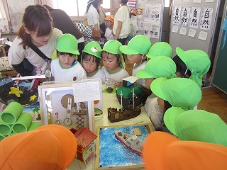 素敵な作品や貯金箱など、小学生のお兄さんお姉さんの力作に、「これすごいな!」「先生みて!」と興味津々のこどもたちでした。