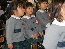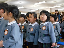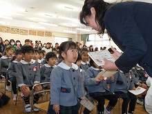 3月23日、3学期終業式を行いました。年長児の修了式を経験した子どもたちは、先生から同じように一人一人名前を呼んでもらい、1年間がんばったことを書いたごほうびの賞状を園長先生からいただきました。頑張ったことを読み上げてもらった子どもたちは、ニコニコとうれしそうに「ありがとう」を言って受け取ることができました。この1年間で、いろんな遊びをしながら様々なことを経験し心も体も大きくなった子どもたち。進級しても、元気一杯過ごしてほしいと思います。
