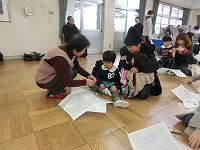 今日は、4歳児親子で凧揚げをしました。凧の先生に教えてもらいながらひもを結んだり、足をつけたりして凧を完成させ、小学校の運動場で元気よく走って凧揚げをしました。雪が舞う中でしたが、子どもたちは寒さに負けず、いっぱい走って遊びました。「おもしろかった」と、凧揚げ初体験の子どももいて、いっぱい走って凧があがる様子に満足そうな様子でした。昔ながらの手先を使ってつくること、体を使って遊ぶことの楽しさを大切にしていき、子どもたちにも継承していきたいと思います。