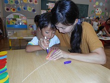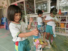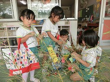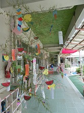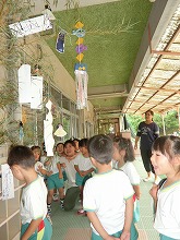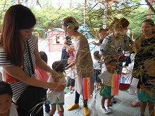 今日は、3歳児はお家の人と一緒に「牛乳がいっぱい飲めるようになりますように」「友達といっぱい遊べますように」と、思い思いの願い事を考えて飾りました。4歳児は、「笹の葉さらさら~♪」と、笹飾りの前で歌いながら、みんなの笹飾りを見上げていました。5歳児も、「一番高いところに飾ろう」「願いごと自分で書いたよ」と、工夫して作った笹飾りを飾りました。5色の短冊の色には、それぞれ意味があり色ごとに願いが込められているそうです。みんなの短冊が風で涼しそうに揺れていました。