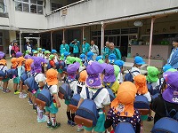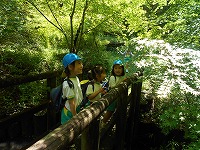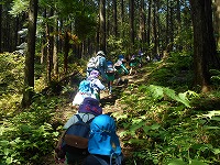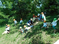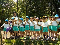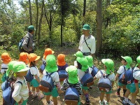 いつものように元気よく「エイエイオー」の掛け声をかけて出発」!途中から、4、5歳児はわかれて山の中を歩きました。