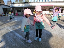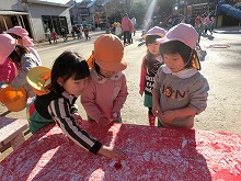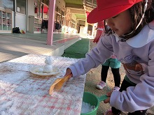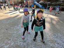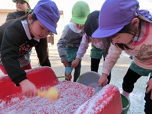 うっすらと雪が積もっていました。登園してきた子ども達の中には、氷やバケツいっぱいに雪を集めて持ってきた子がいて、着替えを済ますなり園庭に飛び出していきます。「いっぱい雪集めよ」「かわいい雪だるまつくったよ」「地面凍っててスケートみたい」と、寒さを気にせず元気いっぱいの子どもたちです。