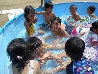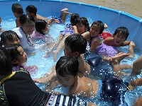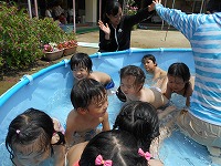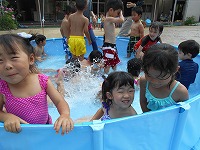 幼稚園のプールで、子どもたちが、足をバタ足にして水しぶきをあびたり「つめたーい」「わにさんになって泳ごう」と、水の心地よさを感じながら遊びました。夏の間は、幼稚園や小学校のプールをお借りして、存分に水遊びを楽しみたいと思います。