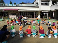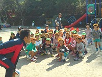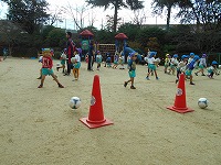 今日は、京都サンガのコーチにボールを使う遊びを教えてもらいました。「お友達のところまでボールが届くかな」「ボールを蹴って三角コーンにあててみよう」と、投げたり蹴ったりといろんなボールの遊び方に挑戦しました。コントロールが難しそうでしたが、友達と一緒にボールに触れながら楽しくいろんな遊びをすることができました。