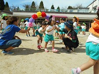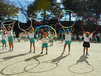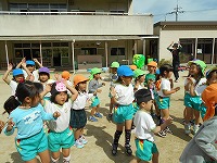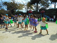 今日は、運動会の障害走やリズム遊びをみんなで楽しみました。「やったー、OLA!の踊りできるわ」「かぜひききんの役になる!」と、他の学年の競技も覚えていて異年齢の友達とのふれあいも嬉しそうでした。