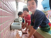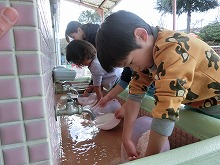 今日5日は、もちつき大会。前日には5歳児が「お手伝いしたことあるよ」「水冷たいな」と言いながら、もち米を洗い準備をしてくれました。
