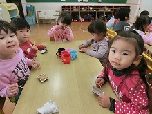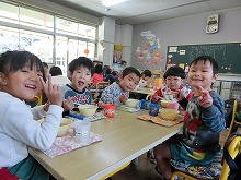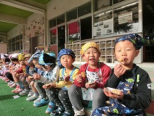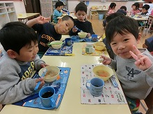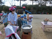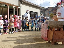 友達の餅をつく様子を応援しながら、「杵はどれだけ重いんかな」と、興味津々です。つきたての餅をきな粉餅にすると、どの子も「おいしーい」「おかわりほしいわ」と、ペロリと食べました。お昼には雑煮も食べ満足そうな子ども達です。今日は、杵で餅をついたり、つきたての餅を食べた子ども達。昔ながらの日本の伝統行事を味わいました。