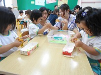 はさみで、折り紙をちょきんと一回切りに真剣な顔で挑戦した子ども達。