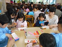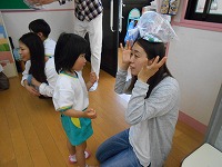 「じょうずね」「いっぱい紙ができたね」と、お家の方に褒めてもらい嬉しそうです。細かく切った折り紙を袋につめて、ボールをつくりました。お家の方と投げあいっこをしたり、頭にのせたりしながらの触れ合い遊び。最後には、「大きなボールになった」と、みんなで回してあそびました。参観のご協力ありがとうございました。