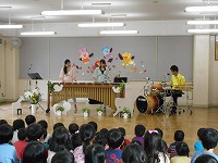 マリンバのとドラムの心地よい音楽が奏でられると、「わぁ きれい」と、思わず感嘆の声があがった子ども達です。一緒に歌ったり、リズムに合わせて体を動かしたりと、なかなかお目にかかれない本物の楽器と演奏に、触れる事ができました。