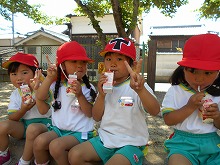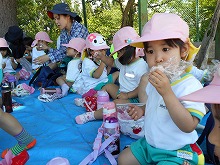 幼稚園と違う遊具で遊んだり、大きな滑り台を滑ったり、草花を見つけたりと、いっぱい遊んだあとは、ジュースのおやつでほっこり。