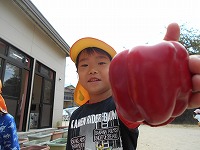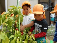 4歳児の子どもたちが、育てていたパプリカの収穫が最後になりました。パプリカは、緑色から赤色や黄色になるまで1か月くらいかかるようで「色が変わらないかなー」と、毎日見ていた子どもたちです。幼稚園で調理しおいしくいただきました。自分たちで世話をした野菜は特別おいしかったようです。
