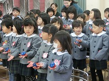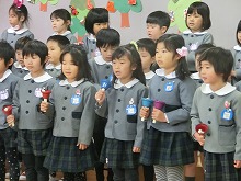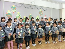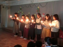 今日は、クリスマス会。キャンドルサービスの温かな炎をみんなで見つめながら、「みんなが幸せになるように・・・」と、園長先生からお話を聞きました。その後、クリスマスの曲を一緒に歌ったり、リズムをとったりしながら楽しく過ごしました。