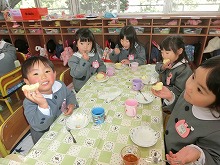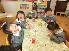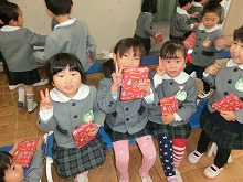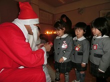 子どもたちは、一人一人握手をしてもらいながらプレゼントをいただいてしっかりとお礼をいうことができ、クラスではクリスマスケーキを食べ幸せそうな笑顔がいっぱいでした。