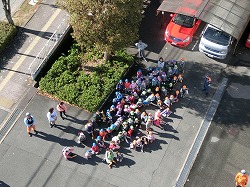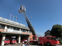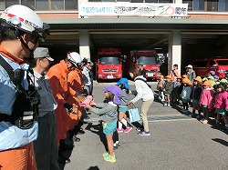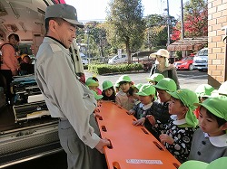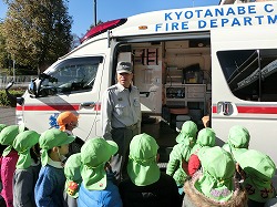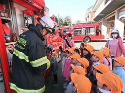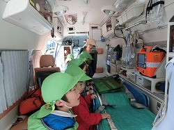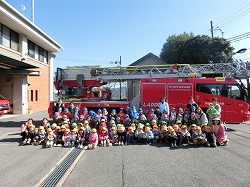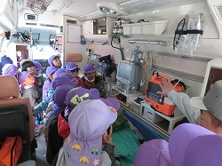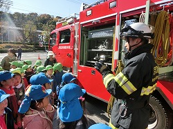 4,5歳児の子どもたちが、消防署の見学に行きました。子どもたちは、クラスに分かれて救急車や消防車を見学し「これは何に使うんですか」といろいろな質問をしました。「これは担架だよ」「ホースは100mあるよ」など、いろいろな器具や機械を見ながらいろいろわかりやすく教えてもらい興味津々の子どもたちです。訓練の様子も見せてもらい、救助訓練では実際にはしごを高く伸ばしてもらい「たかーい」「すごーい」と歓声があがっていました。