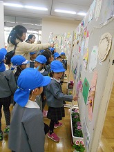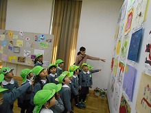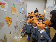 消防署見学の帰り道、隣の施設に展示している「京田辺市立絵画展」も見に行きました。「どんな絵があるんかな」と、自分たちの絵や作品が展示しているのを楽しみにしていたようで、「○○ちゃんのあった」「これ上手やな」と、いろんな作品に興味をもって見ることができました。