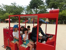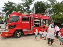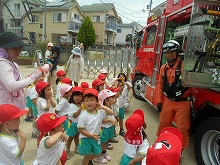 今日は、幼稚園で防火教室がありました。消防車が幼稚園にくると「わー!消防車来たー」と、子どもたちは大喜び。ホールで、