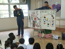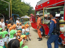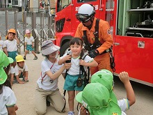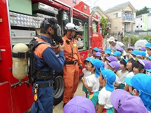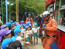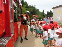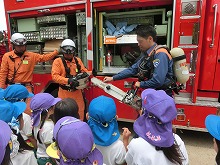 花火の安全な遊び方の話や火事の怖さを知るアニメ映画を見せてもらい、子どもたちは真剣な顔でした。避難訓練をした後は、消防士さんから、救助工作車の装備している機械や道具の話を詳しく教えてもらいました。「これは、防煙マスクでここに空気が入っているよ」「木でも鉄でもなんでも切れるのこぎりだよ」の説明に、「なんでも切れるのすごいな」「空気入ってるの重い?」など、興味津々でした。みんなの命を守ってくださる消防士さんに憧れの気持ちをもち、消防士の仕事に興味関心を持つことができました。