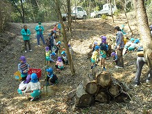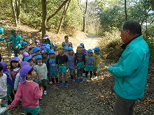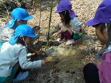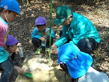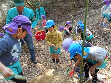 幼稚園生活3年間で、何度も登った甘南備山。5歳児が、甘南備山保存会の皆さんと一緒にモミジとコナラの木を記念植樹をしました。「木も大きくなるから、みんなも小学校へ行ってもすくすくと大きくなってや」「大きくなった木をまた見に、甘南備山に登りにきてな」とお話ししていただき、友達と一緒に楽しく木を植えることができました。甘南備山に幼稚園生活の思い出のあしあとを残すことができました。甘南備山保存会の皆さま、ありがとうございました。