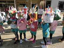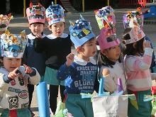 今日から2月。一足早く、節分の豆まきをしました。子どもたちは自分で作った鬼のお面を被って、みんなで見せ合いっこをしました。