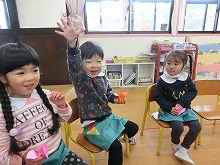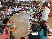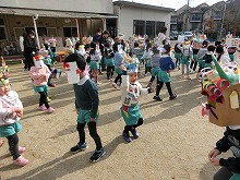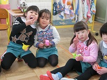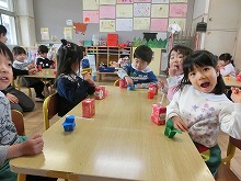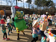 そうしているうちに、大きな鬼が幼稚園にやってきて、みんなびっくり!、「鬼は外!福は内!」と、元気よく豆まきをして、鬼を追い払うことができました。「自分のおなかの中にいる、悪い鬼さんもやっつけよう!」と、園庭を元気よく走って豆まきを楽しんだ子どもたちです。クラスでは、歳の数の豆を食べ、一年間の健康を願いました。