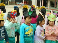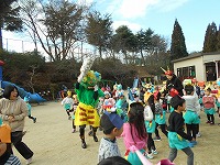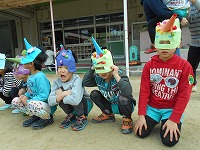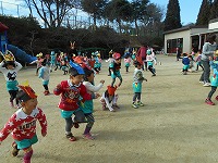 今日は節分。幼稚園の園庭には鬼の面をつけた子ども達が集まりました