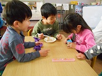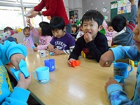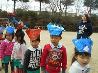 みんなの力を合わせ、無事鬼をやっつけた後は、子どもが鬼役になり、笑顔いっぱいの豆まきを楽しみ、クラスでは、折り紙を折って自分で作った「三方」に豆を入れて、年の数より一つ多く豆を頂きました。年少児も、年長組のお兄さん・お姉さんに教えてもらいながら作りました!