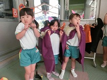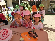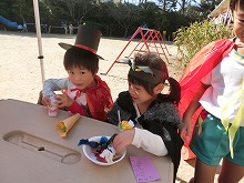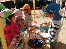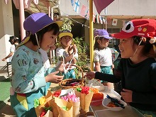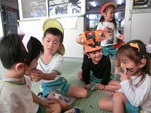 0月は、町もハロウィンの飾りであふれています。幼稚園の子どもたちもよく知っていて、「ハロウィンの仮装したい」「お菓子もらえるねんで」と、仮装フォトショップ、お菓子屋さんなどいろいろなお店屋さんができ遊んでいます。いろいろな年齢の友達との交流もしていて、これからますますお店屋さんが盛り上がりそうです。