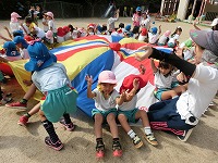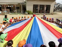 あこがれの年長のフラッグやパラバルーンのリズム遊びを教えてもらいながら楽しそうにしている3、4歳児の子どもたちや親子競技を異年齢の友達と一緒に楽しむ姿など運動会後も子どもたちが色々な学年の競技やリズム遊びをし、友達とのふれあいを楽しんでいます。
