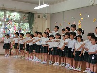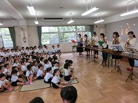 今日は、7月7日七夕の日です。ホールで七夕会をしました。各クラスからは、キラキラ星やアイスクリームなどの曲を、楽器や歌遊びで披露をしました。その後は、ラササヤンというグループの方に、アンクルンという、竹でつくられたインドネシアの楽器演奏をきかせていただきました。竹の心地よい音色に子供たちは聞き入り、知っている曲では一緒に歌ったりと楽しい素敵な時間を過ごすことができました。
