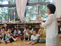3歳児親子が、講師の先生にきていただき、わらべ歌遊びで楽しみました。わらべ歌の心地よいリズムに合わせて、あ母さんと一緒に手遊びやふれあい遊びをしていると、あまりの心地よさに、お母さんにもたれて、ゆったりした気分になる子どももいました。わらべ歌遊びで、昔から受け継がれている遊びを楽しんでいきたいと思います。7月も親子で遊びます。