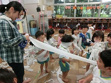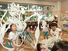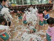 今日は雨で戸外で遊べませんでしたが、草木や花々には恵みの雨となりました。3歳児のクラスでは、「ぐるぐるぐるー」とトイレットペーパーを引っ張ってお部屋いっぱい紙だらけにし、楽しい遊びがはじまりました。キャーと楽しい歓声があがります。「雪ふった!」「あわあわシャンプーみたい」「お風呂にしよう」と、いろんな見立て遊びをして、雨の日も気持ちを発散して遊ぶことができました。